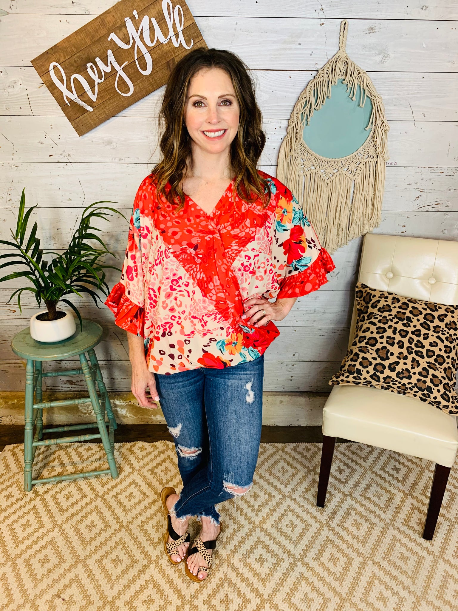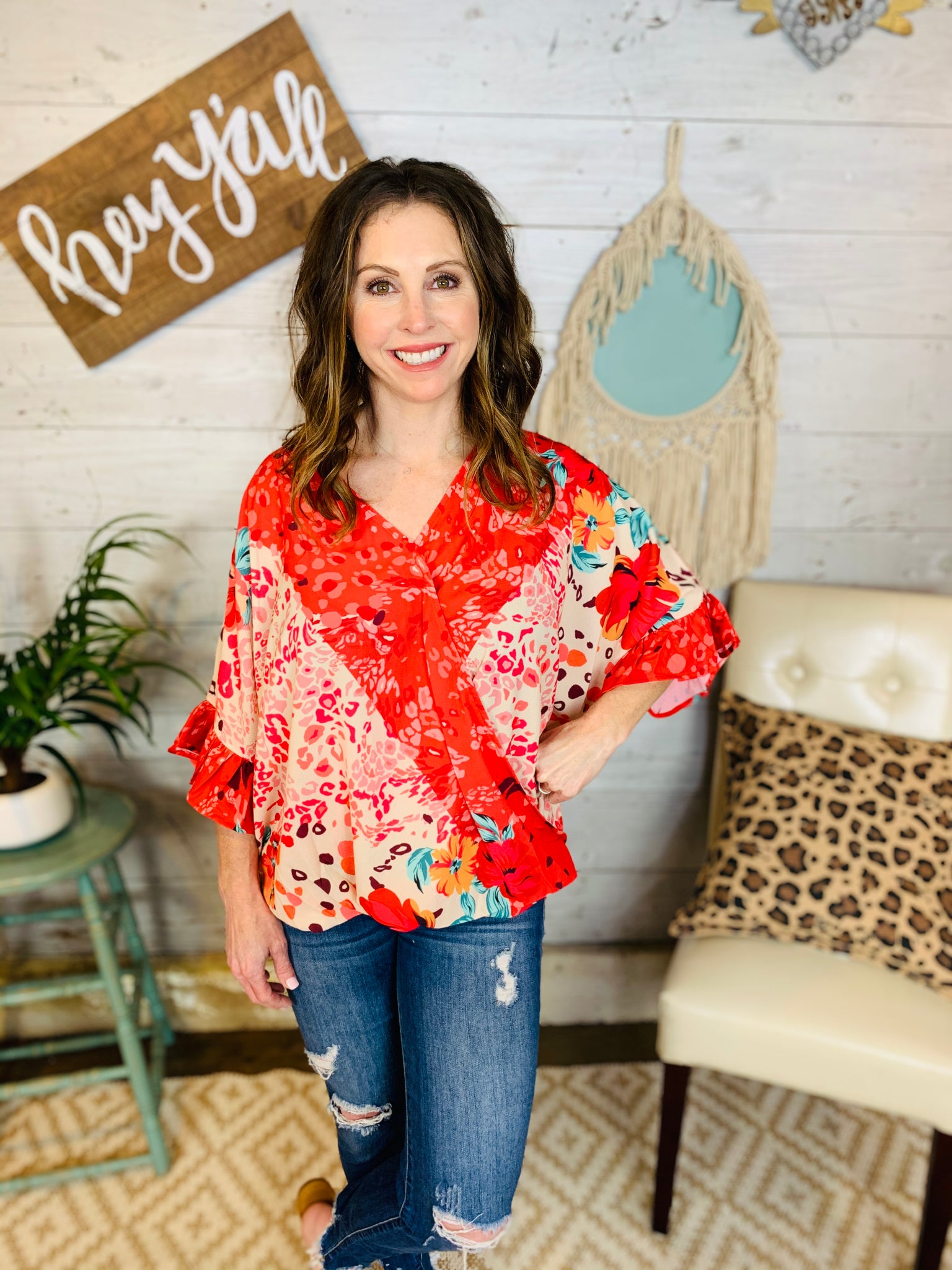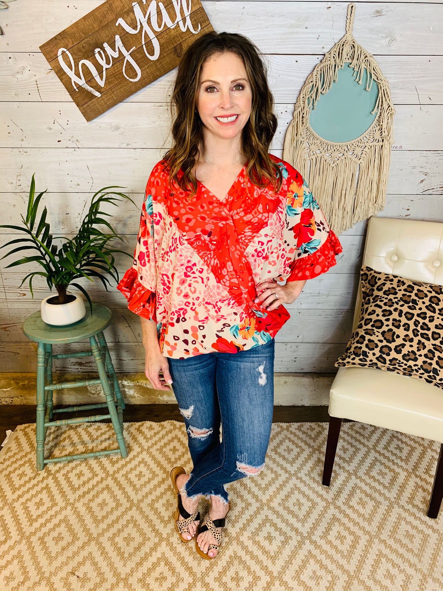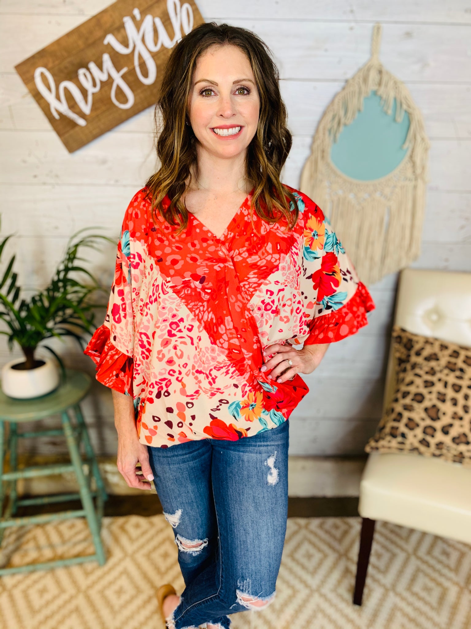 Who is ready for Spring? This top is made for fun! The floral and animal print mix are the perfect combo!