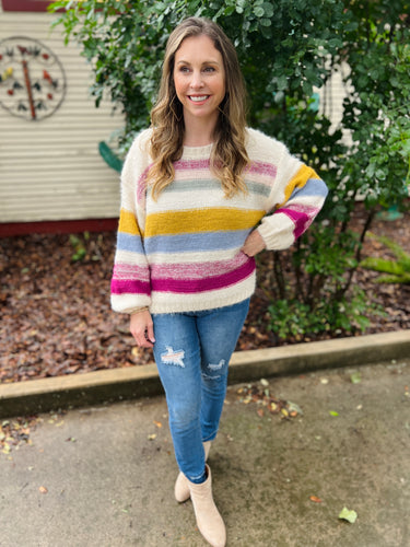 Fuzzy Crew Neck Stripe Sweater