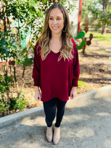 Merlot V Neck Smocked Sleeved Blouse