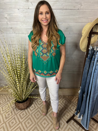 Emerald Top with Colorful Embroidery