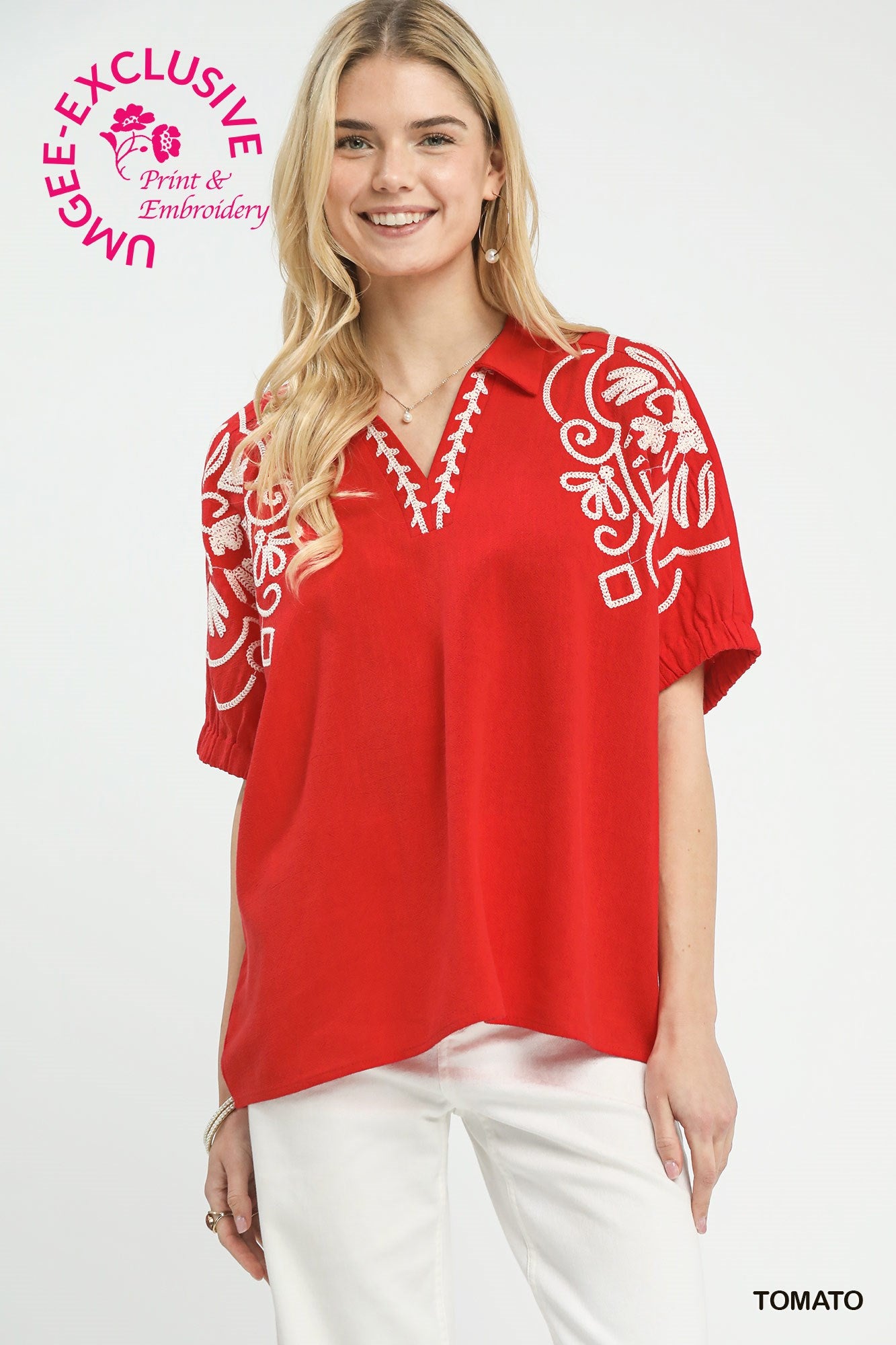 Key Features• Linen• Split V-neck• Embroidered trim• Short puff sleeves with elastic cuffs• Not LinedFabric Contents• 55% Linen• 45% Cotton